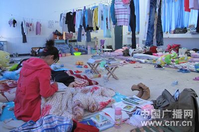 在学生的指引下,记者很容易就找到了被用作住宿的教学楼。虽然之前听到过家长的描述,踏进其中一个教室,记者还是吃惊不小。空荡荡的大教室,没有桌子、没有凳子,虽被当成临时宿舍,却没有一张床,几十包行李杂乱地堆在一边,三十多床被褥直接铺在水泥地上,中间只隔着不到两公分厚的胶合板。半空中一根钢丝将教室一分为二,挂在上面的衣服还在不停地滴着水。