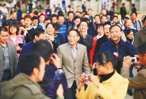 在偶像袁隆平面前,上百名学生一手拿相机或手机,一手拿笔记本欲求签名,将现场围得水泄不通。昨天,80岁高龄的世界“杂交水稻之父”、中国工程院院士袁隆平一走进云南农业大学,立即成为师生追捧的对象,现场不亚于任何大牌演艺明星出场。