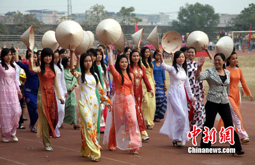 中新网南宁11月12日电(陈妹 黄艳梅)14名泰国留学生合着音乐节拍用舞蹈演绎泰国传统文化节日“泰国火箭节”,一群越南女孩身着各色民族服饰挥动越南斗笠与中国师生互动,来自东盟其他国家的留学生走在方块队伍中展示着灿烂笑容……