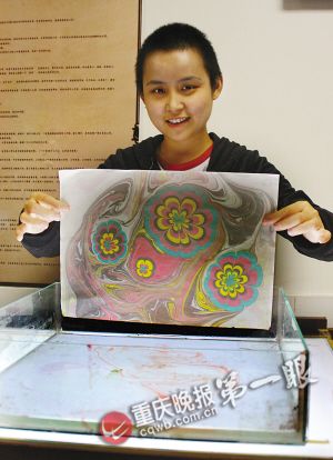 在平静的液体表面上用滴管或锥笔滴入配好的颜料,任其扩散后用针笔人为引导塑造出各种造型,结束后用宣纸轻轻铺在水面上,将颜料拓在宣纸上,晾干后即可长时间保存。(记者 周圆 摄影报道)