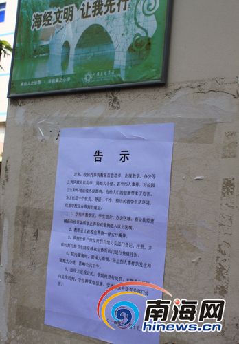 11月24日,南海网记者来到海经院了解情况,在校门口警卫处看到学校张贴的“禁狗”告示:近日,校园内养狗数量日益增多,出现教学、办公等公共区域犬只乱串、随处大小便、甚至伤人事件,对校园卫生和环境造成不良影响,也给人们的健康带来了危害。