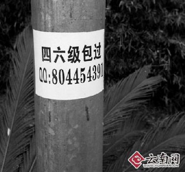 昆明某高校一位姓杨的保安告诉记者,从11月下旬起,在学校的广告栏、自习室、宿舍区、甚至景观树上都张贴了不少出售英语四六级答案的小广告。由于比较隐蔽,厕所成了这类小广告的集中地。记者发现,这些广告五花八门,有的专门卖四六级答案,有的几乎涵盖了所有考试,从医药、财会、职称考试,还有的附带着卖作弊设备,自称“助考界的设备之王”。