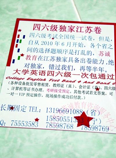 至于价格,这个店家倒比较“适中”,“你阿是真心要?真要的话我们100块配齐全套东西给你。”记者以价格太高为由表示“再看看”,不甘心的店主还一路追上来表示,“最低价80,再低就不卖了。考个六级证书和80块比起来哪个划算?你自己想想唉!”杨甜子 蔡蕴琦 张琳