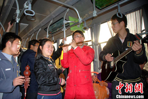 中新网郑州12月21日电(胡影 崔岩新)“河山只在我梦里,祖国已多年未亲近……”昨天下午,郑州市一辆快速公交车上响起了《我的中国心》优美的旋律。这是河南某高校四名大学生为表达对社会的感恩之情自愿发起的“公交车上送音乐”活动,他们希望用自己的歌声和弹奏出的优美旋律给劳累的人们带来清爽和温馨。
