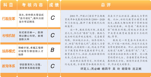 一年过去了。日前,记者专访11位教授中的5人,请他们为2010年度教改打分。在行政改革、考核机制、培养模式和教育体系四个“科目”中,5位教授打分相加、平均后,各科成绩依次为:C、C、B、C;总评:C(B为“良”,C为“及格”)(见右表)。