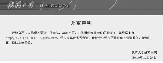 导报记者在武汉大学网站上看到这样一则申明:近期有不法人员侵入研究生网站,篡改网页,非法提供专业学位证书查询……经核实其数据系伪造,我校专业学位不提供网上查询服务。落款为武汉大学研究生院,时间是2010年11月24日。
