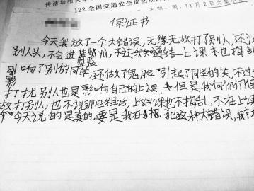 随后,吴女士将儿子接回家,在回家途中她突然想起,儿子不怕自己,却怕警察。“何不让警察帮忙管教。”于是,她让儿子现场写下一份保证书,向警察保证不在学校调皮捣蛋、打骂同学,否则要被“关进监狱”。没想到这招还挺灵,阿贺马上承认错误,乖乖地写了一份保证书,虽然写得歪歪扭扭,还有不少错别字,但态度很端正。