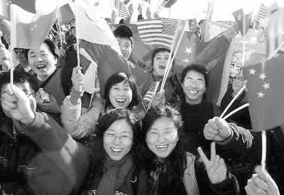 图为北加州的中国留学生为奥运圣火传递摇旗呐喊。