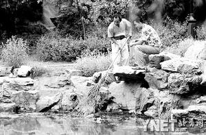 由于游客乱扔东西,居然招来了校外的拾荒者。记者在未名湖畔发现,有一个人正在用一个长长的扫帚“胡噜”水面上的塑料瓶。