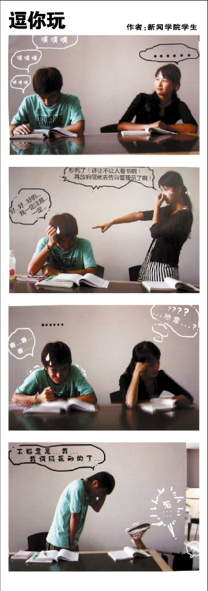 何谓真人四格漫画?就是每一格分别突显开头、发展、高潮和结尾以表现一个简单而充满寓意故事。此前在网络上以真人漫画一炮走红的是“非常真人”组合,现在华工校园到处活跃着这样的“非常真人”。