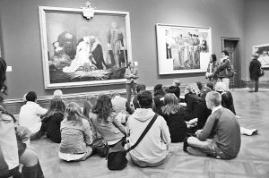 和中国的情况不同,欧美国家的中小学生则把去美术馆视为平常之事,西方人从小就有定期参观美术馆、博物馆等公共文化空间的习惯,而欧美国家的美术馆、博物馆也把为孩子服务看作最重要的工作之一。记者曾先后去过法国、英国采访,发现无论是法国的卢浮宫、大皇宫国家美术馆,还是英国的大英博物馆、国家画廊,到处都可以看到孩子的身影,而且不少是由学校组织带队参观,甚至还有一些老师直接在美术馆里为学生上课。