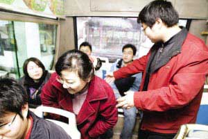 在天星桥车站,一名提着塑料袋、满头白发的婆婆上了车,5名学生同时起立,“婆婆坐这儿!”车子继续前进,几名学生轮番让座,让完座后又开始四处“卡位”占住座位,然后再让座。“我让了三次!嘿嘿!”一趟下来,身手最为敏捷的陈彬排在让座的第一名。