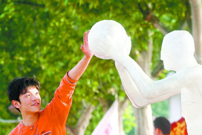 因为爱用胶布缠手指的小习惯,他有了用胶布缠人体做模型的想法。于是,就有了花费一个多月时间,用胶布缠出来的8种奥运比赛项目模型。昨天,由刘岩创意的“奥运来了”模型展,在轻院林荫大道上掀起了一场不小的白色风暴。