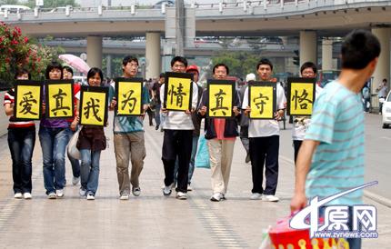 昨日上午,几个来自中原工学院的大学生举着“恪守真情为我真爱”的牌子出现在紫荆山广场附近,他们选择年轻人,特别是年轻情侣密集的地方活动,并请求他们在自己准备好的横幅上签名,支持自己“把第一次留给自己最爱的人”的观点。
