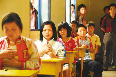 “我们能够从这么多灾难中走出来,拥有这次新的生命,我们应该珍爱生命,对吗?”董慧娟举起双手做出心形的手势,双手接触的心形——“珍爱”,双手分开的心形——“生命”。小小大大的心形交替出现在孩子们的手间,朗朗的声音“珍爱”、“生命”在教室里回荡。