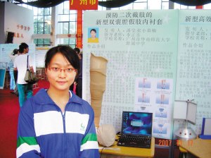 因常看到不少截肢者因配不到合适的假肢,而出现残肢下端过敏,甚至溃烂的惨状,华南师范大学附属中学高二的潘莹,她便发明“可调型双囊腔假肢内衬垫”。该发明不但获得大奖无数,还申请了国家专利,并已进行临床实验。潘莹说,希望自己的发明能在2年后,令截肢者舒适地使用假肢。