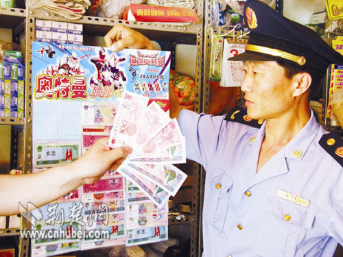 昨日,一名小学生向新洲工商分局举报称,在旧街小学旁“文博商店”等5家学生用品商店,售卖有“儿童奥运存折”、“儿童钱币折纸”等玩具,他认为这些玩具“不能卖”。