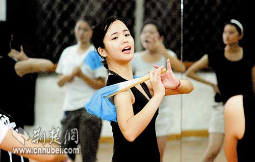 弯腰,摆头,脚尖点地,滑步……伴着古意浓浓的音乐,七名女孩翩翩起舞,优美的身姿让人的目光不禁久久停留。“这不是‘魔女幼熙’么?”记者眼前一亮:领舞者长相颇似热播韩剧《魔女幼熙》的主角。随意的小卷发披在肩头,忽闪忽闪的长睫毛下,大眼睛顾盼生辉,这个“魔女幼熙”名叫黄蓓,武大新闻与传播学院大三学生。每晚给一群将参加“艺考”的高中生上舞蹈课,是她这个暑假的兼职工作。“看清楚啊,像我这样,两手伸直,腰一定要用力弯下去……”从学生的热身准备,到舞蹈中的每个细节乃至眼神,黄蓓都颇为专业地逐个纠正。两小时的教学时间里,她说得最多的一句话是“再来一遍”。在帮助学生做拉伸动作时,有的初学者疼得哇哇叫,她也毫不心软,“怕疼是学不好舞蹈的。”