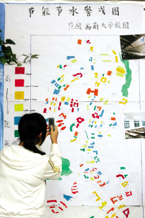 “我们寝室的用电量竟然排全宿舍第一。” 10月11日上午,这张“校园节能地图”出现在西南大学广场的展板上,吸引了不少同学的眼球。校内的教学楼、宿舍和道路的用水量和用电量,都以鲜艳的颜色标注在地图上,教学楼则成为用电量最大的区域。