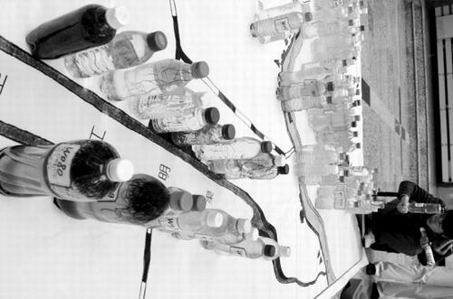 我们每天呼吸到的空气,被装进了蓝色的气球里,高高地飘在地图的最上面。它代表着沈阳市的蓝天。气球下面用透明的绳子拴着几十张照片。仔细一看,这些照片有浑河沿岸美丽的风光、有夕阳、有绿树,有老人垂钓、有儿童嬉戏,也有学生们拿着瓶子取水样的场景。而在地图的最下方,则是一张平面的手绘浑河、卫工明渠等沈阳水质图。图的上面摆放着大小不一的塑料瓶,瓶里装着学生们采来的水样。