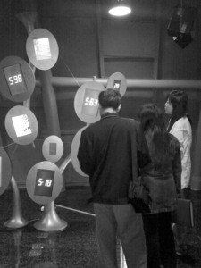 时间可以捕捉吗?不断流动的时间如何直观地表现?一件名为“时间之树”的作品让人切身体会到“光阴易逝”、“时不我待”,这件作品用显示屏同时展示一系列与时间有关的影像,在这里时间被瞬间加速,时间数字和不同时间段的同一场景在这些镜形显示屏上交错呈现,让人顿生紧迫感。