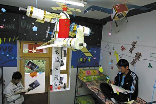 近日,来自西南大学植物保护学院的6名大学生用废旧的塑料瓶、用过的废纸片、垃圾箱内淘来的百事贴等废品将寝室装饰成了太空舱。其效果照片在网上一经发表,立即引来大量点击,网上热议其为山寨版“神七舱”。