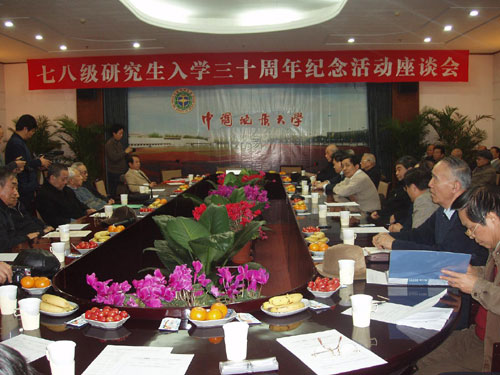 中新网12月10日电 据美国《美中信使报》与《中国地质大学》校刊联合报道: 中国著名的高等学府---中国地质大学于12月6日至12月9日分别在武汉和北京两地举行了隆重的纪念活动, 热烈庆祝该校当年在邓小平同志的亲笔批示和直接关心下恢复研究生教育, 伴随着中国全面改革开放的步伐, 走过了30年的光辉历程. 该校在文革后首批招收的1978级研究生近五十人, 也分别于12月6日和12月8日从全国各地回到北京和武汉两地的母校, 纪念这一载入中国高等教育史册的重要日子, 纪念邓小平同志为该校成立研究生部两次作出的亲笔批示30周年。