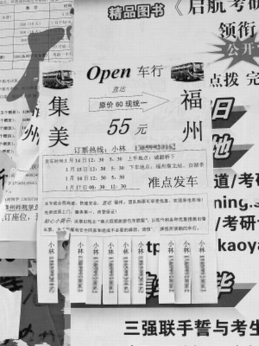 昨日(1月15日),记者走访厦门几所高校发现,在学校餐厅、宿舍楼、广告信息栏等多处地方都贴了很多包车业务的小广告,大部分留下的都是校内学生的联系电话,目的地一般是福州、三明、南平等地。记者从包车广告上看到,每天最少有两个车次,最多高达4个。