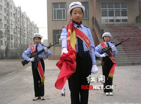 “拿美式枪,护咱的旗,咋看咋别扭!”23日晚上,网友“锅炉工”在红网论坛发帖爆料,称在网易论坛、铁血社区及猫扑大杂烩等网上看到一张雷人图片:三小学生身穿交警服,其中两名手拿M16自动步枪护旗。按说这应是仿真枪,可学校如此 ‘推陈出新’真把俺给吓到了。不过,也有网友认为可能是有人摆拍的恶作剧,或表演什么的。
