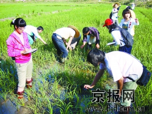 景山学校高一学生张园元说: 我们天天下水田取样、分析研究,明白了什么是水稻突变体以及专家为何要尽力发现和分离有价值的自然突变和变异材料;还知道了水稻三大病害是白叶枯病、稻瘟和纹枯病,其中白叶枯病是常见水稻病。