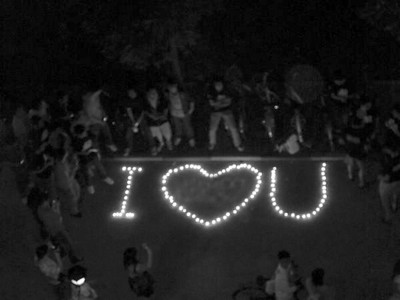 晚报讯 夜色静谧,蜡烛在地上围成一个大大的“心”型,音箱里流淌出舒缓的音乐。“我们爱你!”夜幕中响起男生们大声的表白。“我们也爱你!”楼上的女生们尖叫着回应。