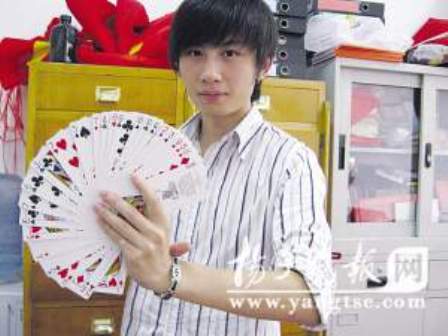 小王介绍,自己学魔术已经有5年历史。高三时,一次朋友生日聚会上,有人表演了扑克牌魔术,深深吸引了他,没有人教,他便利用课余时间从网上下载魔术视频自学。此后又拜访了不少老师,技艺不断提高。在5月27日结束的江苏省魔术大赛上,小王表演的“神笔马良”,用一支普通的签字笔在画板上画了一朵花儿,手一挥,画板上的花儿不见了,出现了一朵真花儿;手再一挥,真花儿不见了,又变回了原来画的花儿,凭借这个魔术,小王获得大学生组冠军。