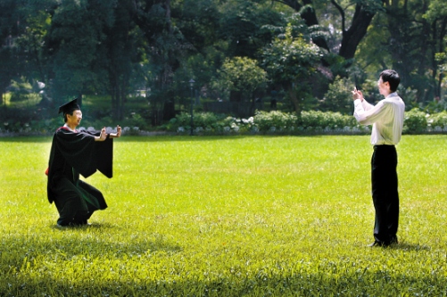 毕业生的节日上,穿上学士服一本正经地拍好毕业照之余,他们还用各式各样活泼的方式庆祝属于自己的成人礼。鬼马可爱,这是昨天记者在中山大学发现的理工学院毕业生严肃形象以外的另一面。炎热的天气难挡他们放飞的心情,在当前严峻的就业形势下,这种乐观积极的心态显得尤为重要。 本报记者 何奔 摄影报道