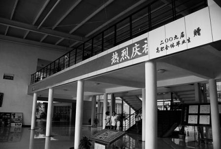昨天下午,记者来到位于宁波市环城北路的教育学院。走进教学楼大厅,正上方镶嵌着一块大约十来米长,半米宽的电子显示屏,屏幕的右边则镶嵌着 “二00九届高职全体毕业生赠”的金字。