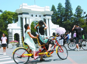暑假来清华、北大等首都著名高校旅游的各地游客持续增加,许多是由学生与家长组成的暑期名校游团队。清华大学每天接待游客一两万人,双休日多达几万人。校方为游客增设了旅游观光车、义务讲解处及24小时自行车租赁等业务,提供便利的人性化服务。 本报特约摄影 李文明 RJ136