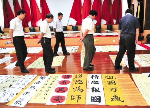 “书写得太好了,真是难以忍痛割爱挑选……”昨日,记者在小学甲组书法作品的评审现场看到,小书法家们的“墨宝”引来书法大师们赞赏声不断。大师们一致感叹:现在有些大学生书法作品确实不及小学生好!