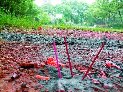 记者在长沙理工大学金盆岭校区了解到,由于该校毗邻湖南革命陵园,某些市民竟在夜里溜到校园里祭祀。师生们反映,前晚7时,在该校教职工宿舍前的空地上,就有人大放鞭炮,还在空地上点香烛,烧纸钱,校园里弥漫着呛鼻的烟味。该校对面的小区路上、绿化带里随处都有人或烧或抛撒纸钱。夜里在校园里散步,不时能看到角落里有人点香烛。