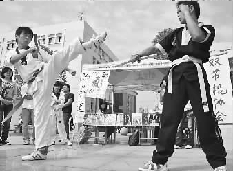 “双节棍社,我们来‘踢馆’了!”中午12时30分,该学院跆拳道社社长朱志枫,向并肩而坐的双截棍社社长刘源下“战书”。双方以各自宣传展板为阵地。刘源左手持双节棍,马步向前;朱志枫握紧双拳,脚下微微踮起,瞬间180度旋转,—招“横踢”接住了刘源“飞”来的双节棍……此举吸引了大量新生咨询、报名。