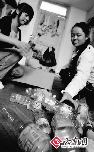 近日,记者路过昆明学院医学院(原昆明市卫生学校)时,遇见三五成群的学生把废弃的饮料瓶拿绳子拴着抬着走出校门,一打听才知道原来是学生们捡饮料瓶卖后换成钱当班费。学校党委副书记曹全科昨天告诉记者:“这种做法是10年前就开始养成的,如今学生捡饮料瓶攒班费在学校里蔚然成风,全校28个班级的2000多名大学生都自觉捡瓶子、卖瓶子,钱拿来当做班费。”