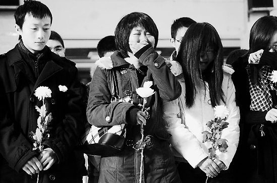 遗体告别仪式开始了。大家朝杨济源三鞠躬后,纷纷献上了白菊花,一直强忍着悲痛的杨妈妈再也支持不住了,好几次冲到济源身边,想再摸摸儿子的脸庞。