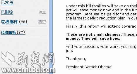 荆楚网消息 (楚天都市报)(记者蔡青)华中科大新闻硕士杨志为一年前曾给奥巴马的个人官方网站发出邮件,提出关于医改的问题。没想到上个月却收到4封回函。“其中有两封直接署名美国总统奥巴马,还有其视频签名。”昨日,杨志为高兴地告诉记者。