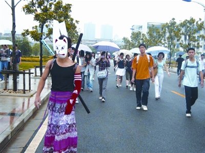 随后,罗果找同学借来面具和忍者刀,找球迷们借了足球袜,又拿出老乡送自己的娃娃,这样就搭配出一身独特装扮。他大概在校园走了半个小时,引起了不小的轰动。最后,同学履约——请他到校外餐馆撮了一顿。