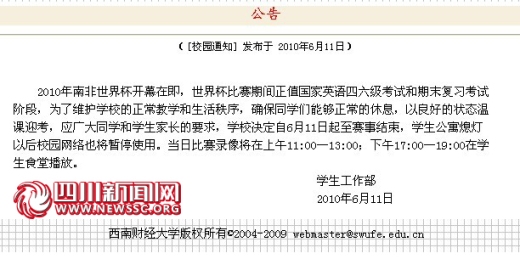 四川新闻网记者在该论坛看到,网名为“大满贯球员”的网友发布了国内10多所著名高校对待收看世界杯的措施。其中西南财经大学的公告内容为:“2010年南非世界杯开幕在即,世界杯比赛期间正值国家英语四六级考试和期末复习考试阶段,为了维护学校的正常教学和生活秩序,确保同学们能够正常的休息,以良好的状态温课迎考,应广大同学和学生家长的要求,学校决定自6月11日起至赛事结束,学生公寓熄灯以后校园网络也将暂停使用。当日比赛录像将在上午11:00—13:00;下午17:00—19:00在学生食堂播放。”,落款为学生工作部。