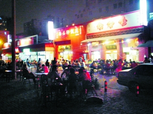 胜古中路位于和平西桥的西北角,不到10米宽的道路两旁布满了各式各样的摊点、饭馆。本就不宽的道路上,错车成了大问题。每天下午6时左右,街上的饭馆便在外面的马路上把桌椅“铺开”。昨晚记者在胜古中路的大排档处看到,在这里喝酒吃串的人们,有的聊着昨晚输球的球队,有的聊着近期顺利或不顺心的生意。随着夜幕降临,大排档的客人也越来越多。