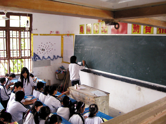 昨天下午3时许,羊城晚报记者来到甲子第一中学。下午第二节课的上课铃恰好敲响,在操场课间休息的学生们纷纷跑回教室,也有不少学生磨蹭着不肯进去。羊城晚报记者从教学楼的一楼走至三楼,只见不少教室均看不到老师在授课,学生们被安排自习,有班干部在黑板上抄写练习题。“有没有老师给你们上课呀?”有几个靠门口的同学摇摇头,称他们从早上开始就自习了。