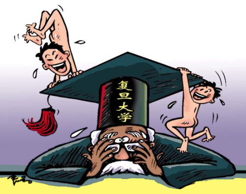 日前,两名毕业在即的复旦男生,头戴学士帽在校园内裸奔庆祝毕业,并拍照留念。 (昨日《羊城晚报》)