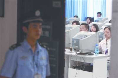 昨日下午,记者在华中师大9号楼一间大教室看到,数十名评卷员整齐地坐在电脑前,教室最前端有一工作人员在电脑前与评卷员对坐着。工作人员说,作文扫描进了电脑,评分都在网上进行。