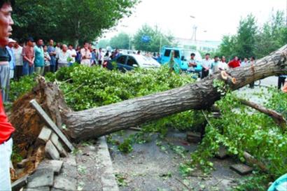 这棵大树的直径足有半米,是在阜新市迎宾大街上,在阜新市长客总站正门斜对面,而在长客总站大门附近也有5棵树被大风或是大雨砸倒。“我来回看了几遍,这棵大树是这一带最粗的一棵树,太倒霉了。 ”三轮车夫老李说。