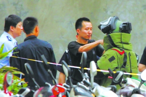 通盛嘉苑交通监理公司门卫何金福老伯告诉记者,“炸弹”当时就装在一个黑色纸袋子里,挂在考点外一楼的一根钢管上,那是他的晾衣竿。