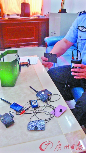 在车辆管理中队,花都交警向记者出示了四台这样的无线作弊器(见左图)。这些作弊器,主要由一粒被固定在扑克牌大小胶片上的无线针孔摄像“纽扣”、一条束胸和一个小型的无线发射器等组成。交警在演示中,首先用束胸将“纽扣”绑定在胸前,随后正常地扣在衣服上。紧接着,则是将与“纽扣”通过连接线联通的无线发射器,挎在腰间。这样的设计,不可谓不巧妙。